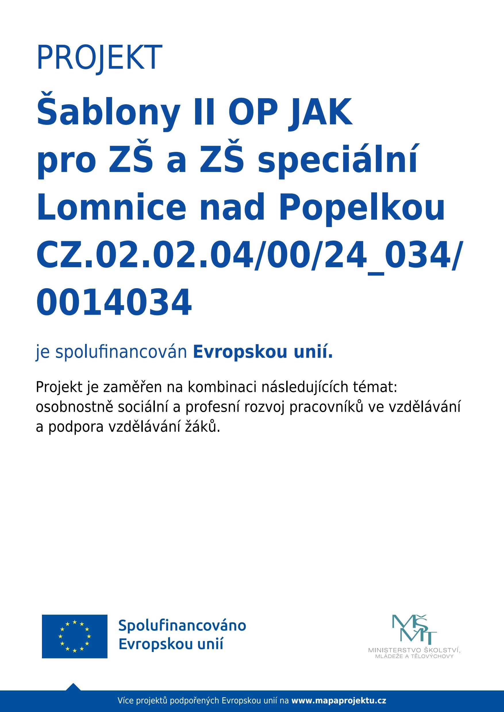 Cílem projektu je přispět k zajištění rovného přístupu ke kvalitnímu a inkluzivnímu vzdělávání pro všechny děti, žáky a účastníky zájmového vzdělávání prostřednictvím vzdělávání pracovníků škol a podpory zavádění inovativních metod vzdělávání za účelem přípravy výuky v souladu s připravovanou revizí rámcových vzdělávacích programů a podpory dětí, žáků a účastníků zájmového vzdělávání ohrožených školním neúspěchem a z marginalizovaných skupin. Průběh projektu od 1.8.2025 do 31.7.2027, doba trvání 24 měsíce. Částka 282 188,-. Reg. číslo projektu : CZ.02.02.04/00/24_034/0014034